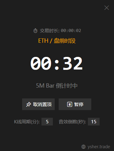 无论是已经入场还是观望中,当某根 K 线看完后暂时无法决定是否交易,我需要等下一根 5 分钟(或自定义 15 分钟)K 线收线 再做判断。这时我可以先去处理其他事,工具会在自定义倒数时间(默认 15 秒) 开始发出音效提醒:每秒响一次,最后收线那一刻用不同音效提示。