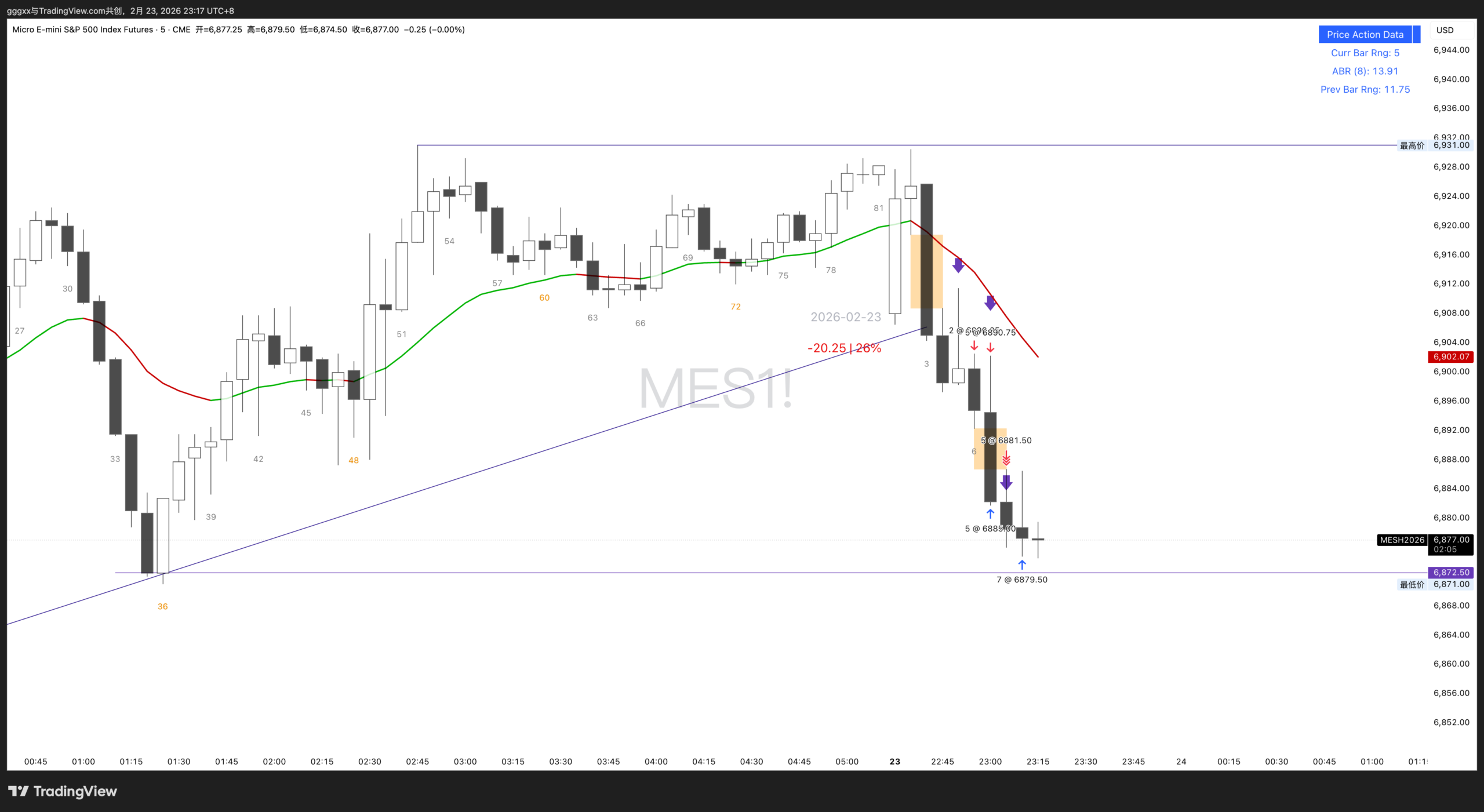 S&P 500 PA Review (MES): 2026.02.23k4低点做空,k6加仓做空,拿到了k3的1Rk7收线后继续空。拿到了k8收线直接全部TP离场。实际上我想拿到昨日k35收盘。那里有很多被套的人希望解套。但是真拿不住。心态问题。