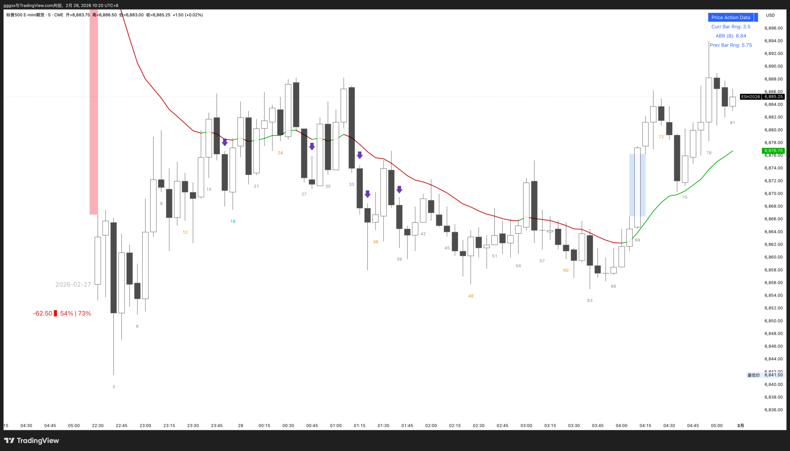 昨天第一笔limit订单,做空。挂在了6879@ema处的地方,于k14成交。此时我预期的是:价格跳空低开,走的是一个三推回调的wedge。但是k15出现了一个收的很好的阳线,于是我第一单在k15上方挂了limit。如果多头触发他们的stop 入场,我就小亏离场。结果真的触发了。于是我止损/保本走了。非常小的试探仓。(图中第一笔的保本位置画的不对。应该指向k15)